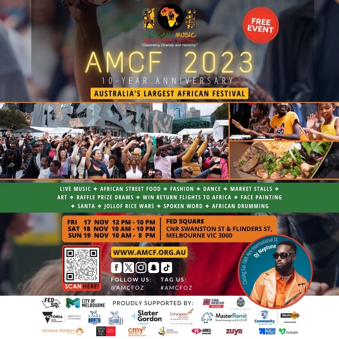 2023 African Music and Cultural Festival Friday 17 November 2023 12:00 pm Sunday 19 November 2023 8:00 pm Melbourne, VIC (map) Google Calendar ICS