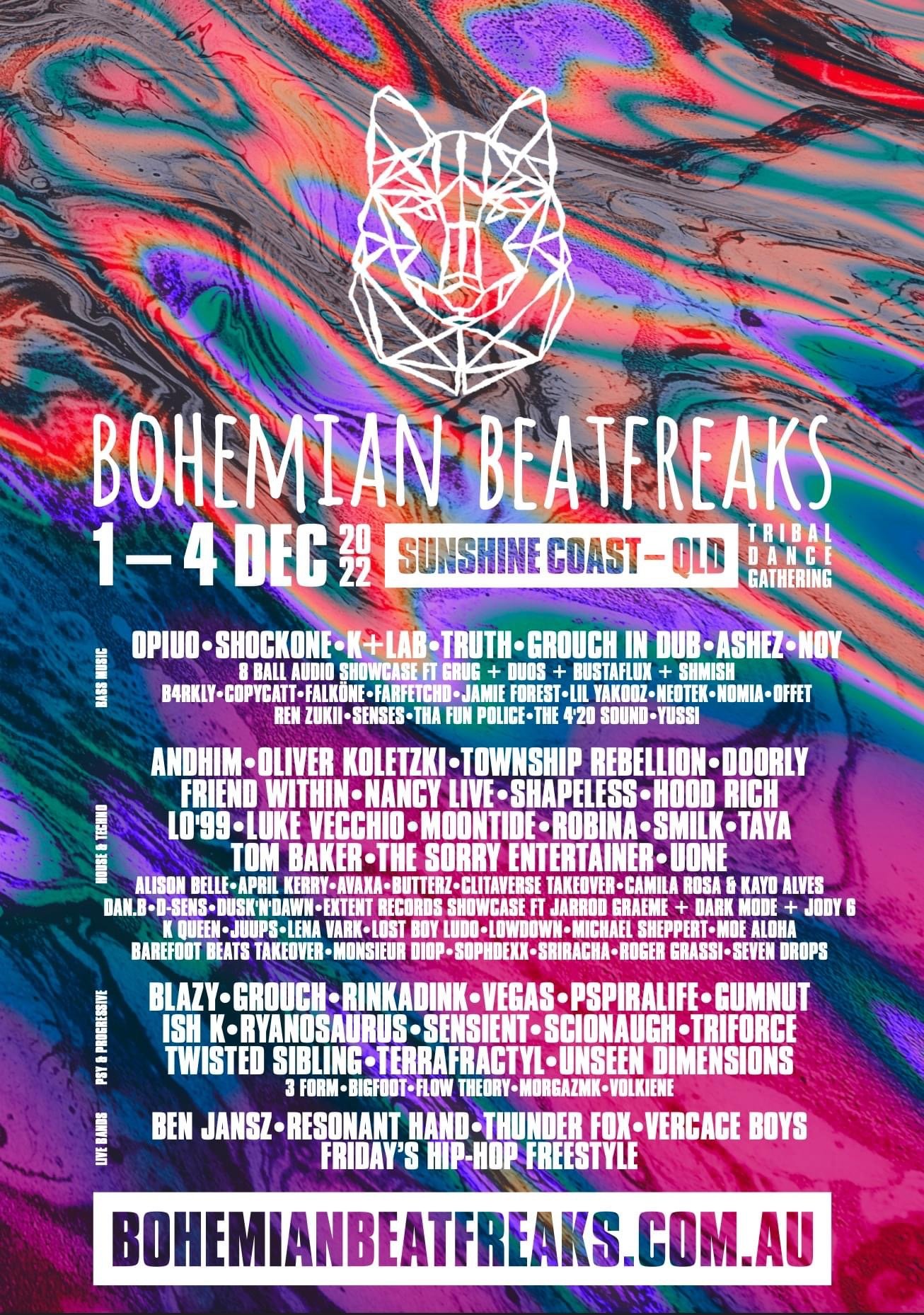 Bohemian Beatfreaks Thursday 1 December 2022 1:00 pm Sunday 4 December 2022 9:00 pm Sunshine Coast, Qld Australia (map) Google Calendar ICS