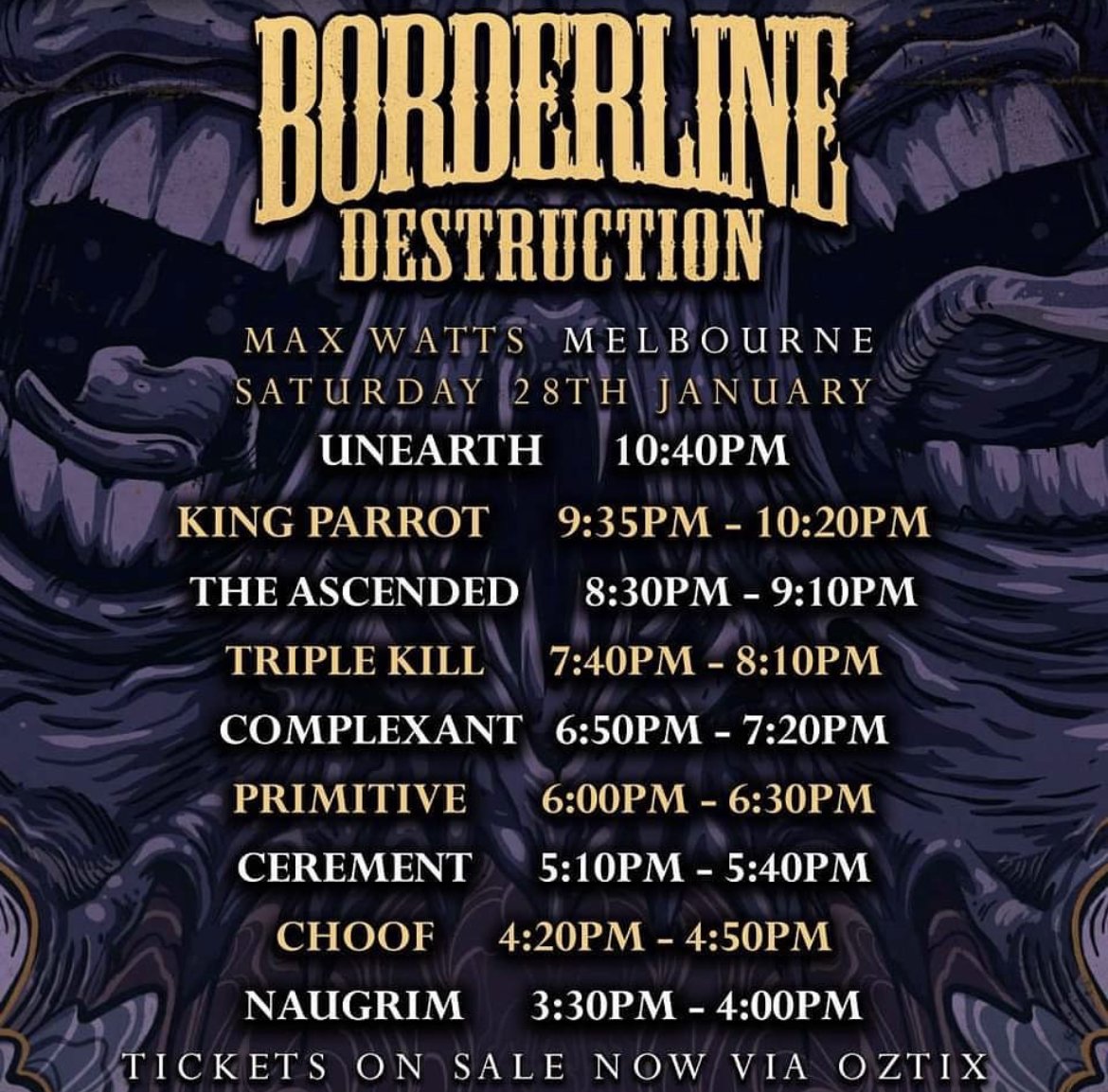 Borderline Destruction Saturday 28 January 2023 5:00 pm 11:30 pm Melbourne, VIC (map) Google Calendar ICS