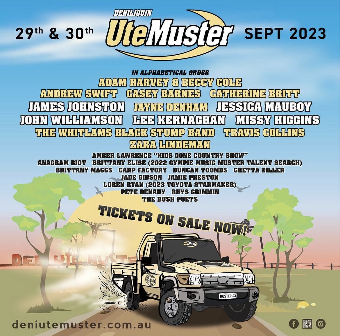 Back to All Events Deniliquin Ute Muster Friday 29 September 2023 4:00 pm Saturday 30 September 2023 11:00 pm Deniliquin, NSW (map) Google Calendar ICS
