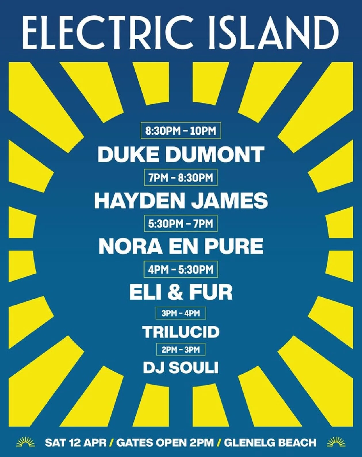 Electric Island Saturday 12 April 2025 2:00 pm 10:00 pm Glenelg Beach, SA Australia (map) Google Calendar ICS