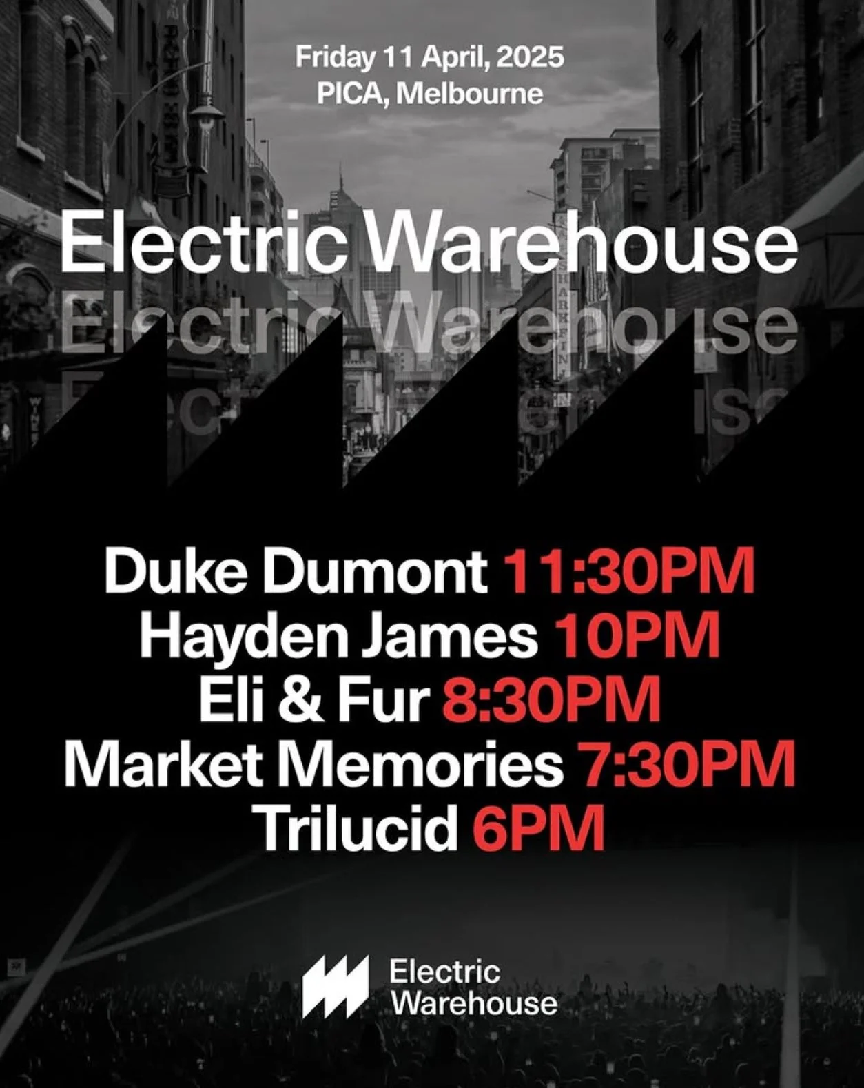Back to All Events Electric Warehouse Friday 11 April 2025 2:00 pm 10:00 pm Melbourne, VIC Australia (map) Google Calendar ICS