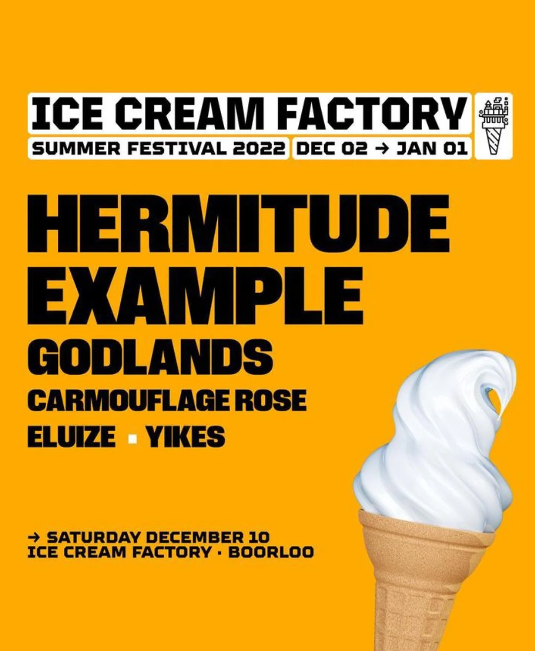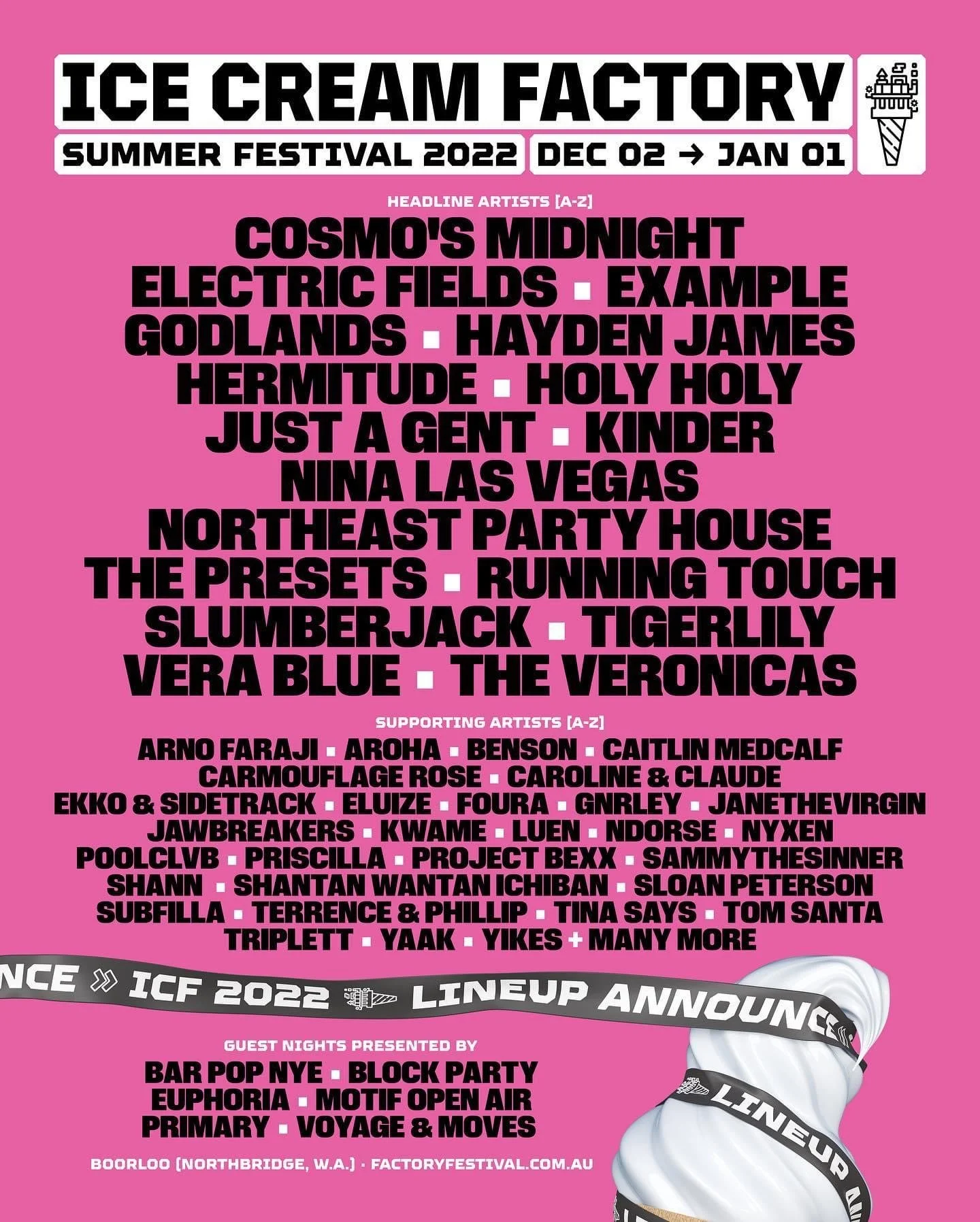 Back to All Events Ice Cream Factory Friday 2 December 2022 6:00 pm Sunday 1 January 2023 10:00 pm Perth , WA Australia (map) Google Calendar ICS