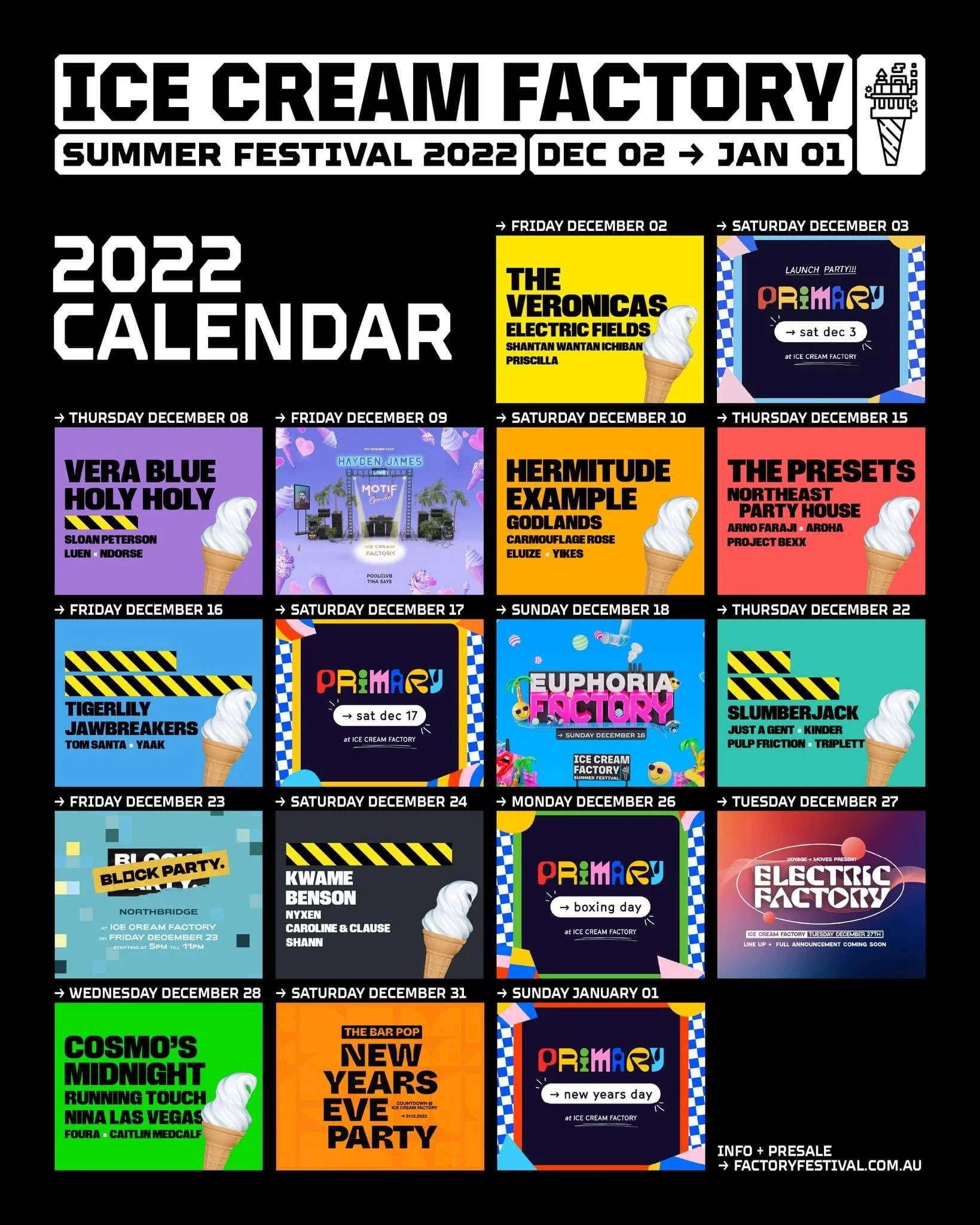 Ice Cream Factory Friday 2 December 2022 6:00 pm Sunday 1 January 2023 10:00 pm Perth , WA Australia (map) Google Calendar ICS