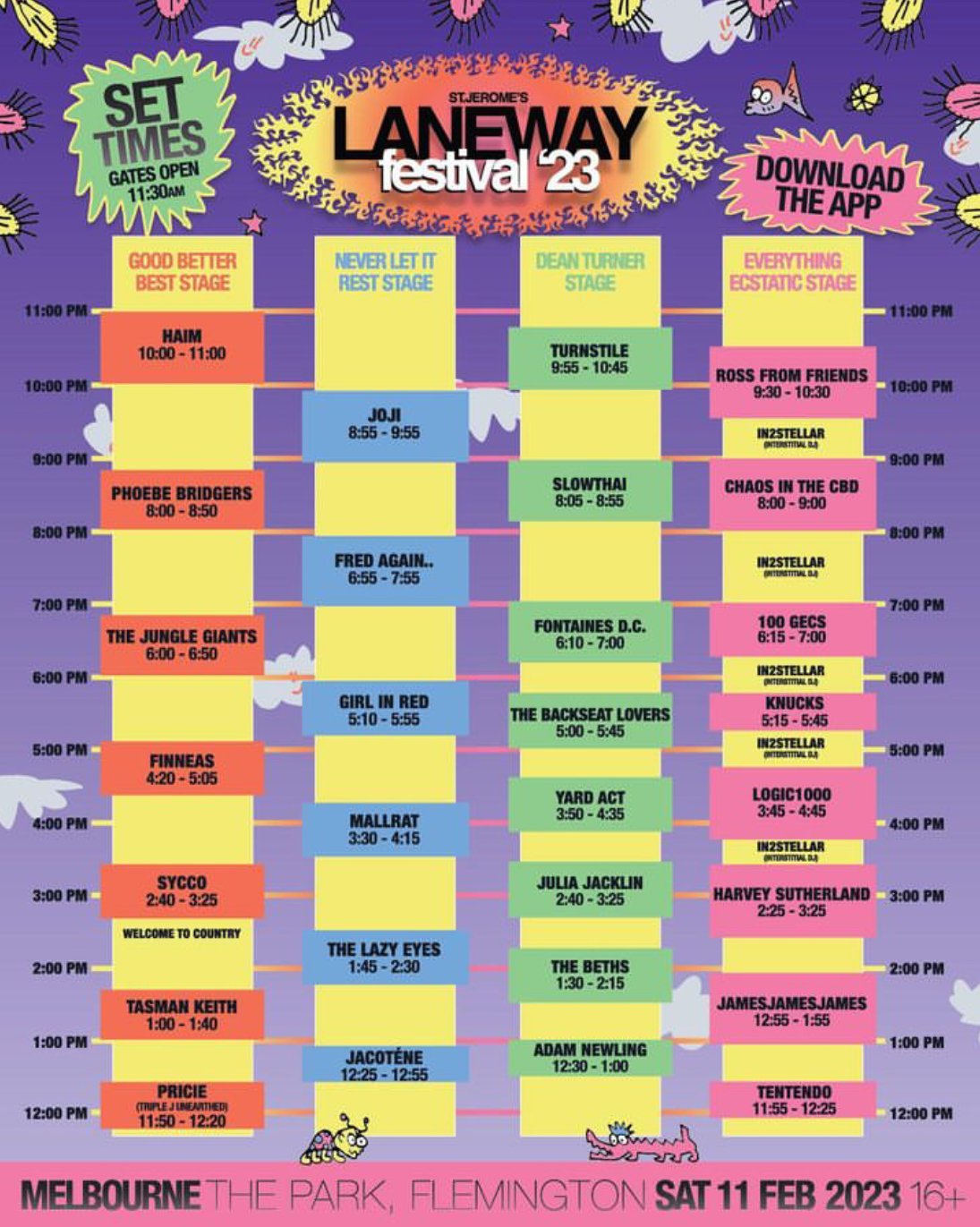 Back to All Events Laneway Festival 2023 Saturday 11 February 2023 2:00 pm 10:00 pm Melbourne, Vic Australia (map) Google Calendar ICS