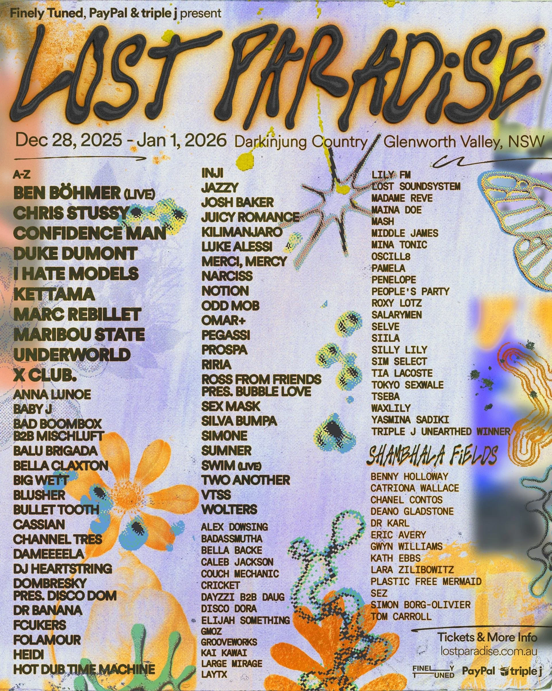 Lost Paradise Sunday 28 December 2025 12:00 pm Thursday 1 January 2026 10:00 pm Glenworth Valley, NSW (map) Google Calendar ICS https://musicfestivalsaustralia.com/news/lets-get-lost-in-paradise