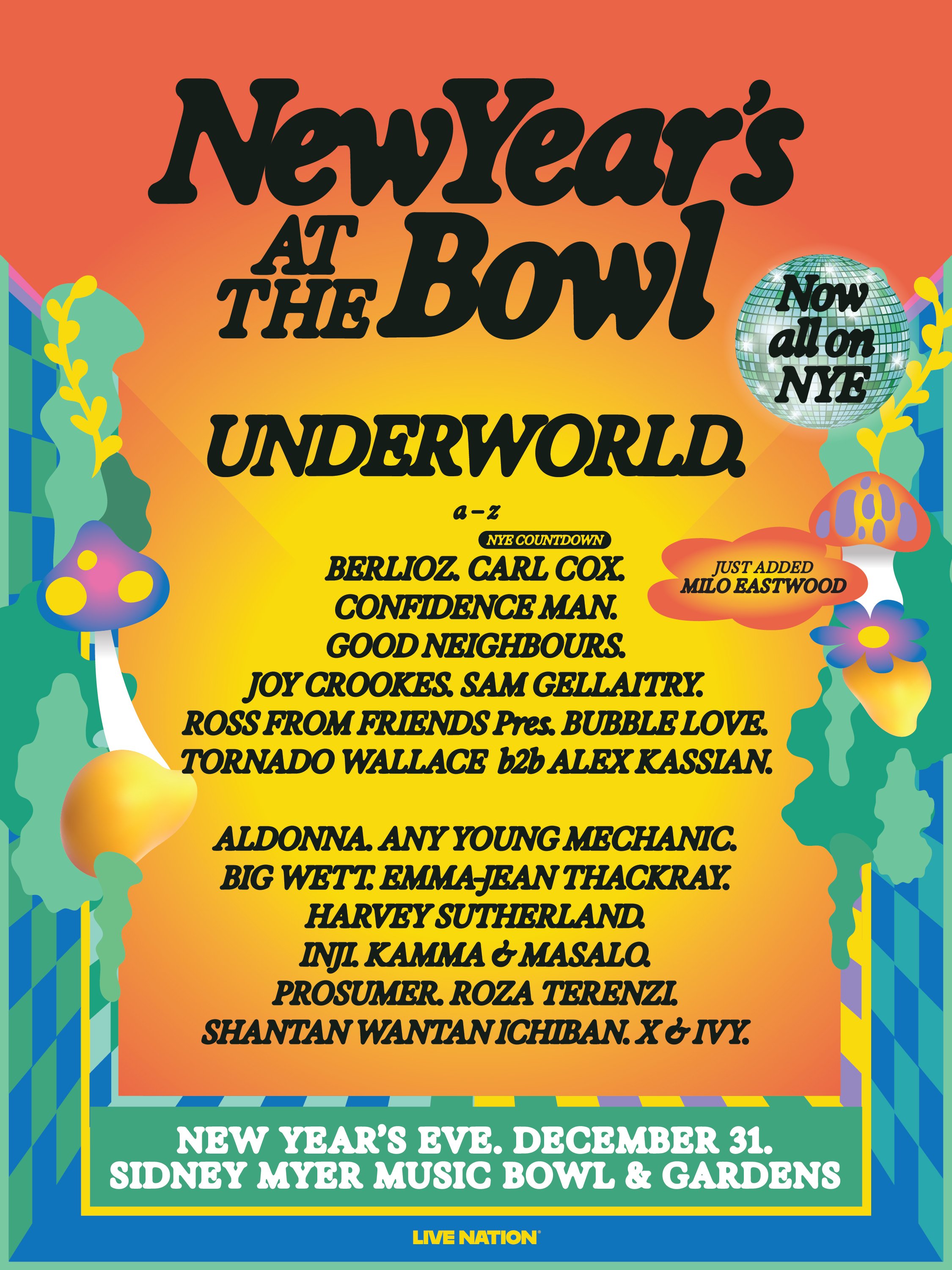 New Year's At The Bowl Wednesday 31 December 2025 2:00 pm Thursday 1 January 2026 1:00 am Melbourne, VIC (map) Google Calendar ICS https://musicfestivalsaustralia.com/news/newyearsatthebowl