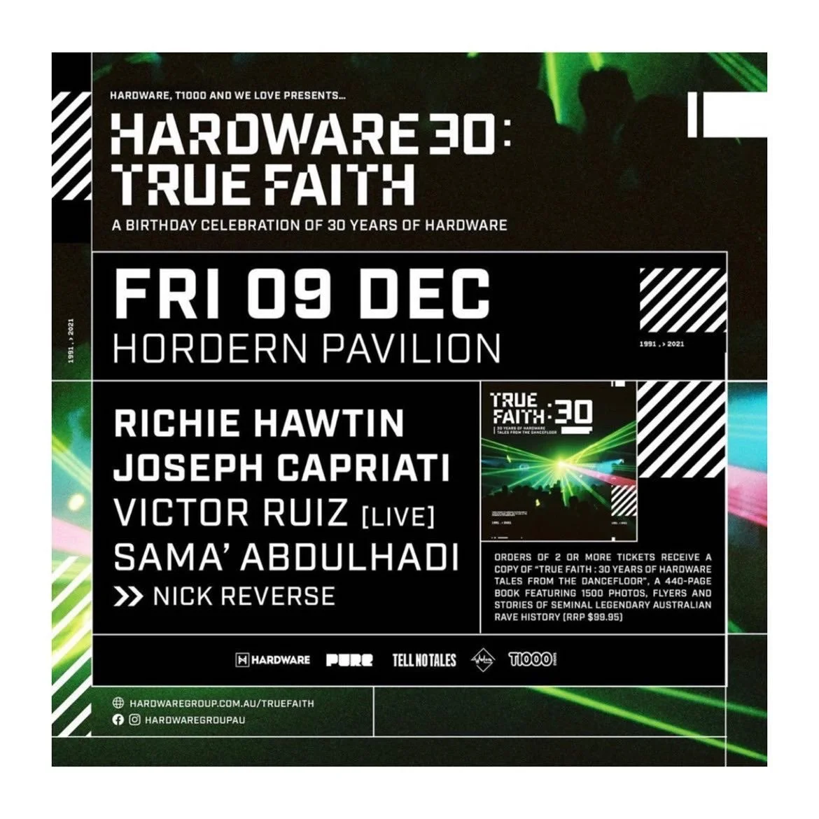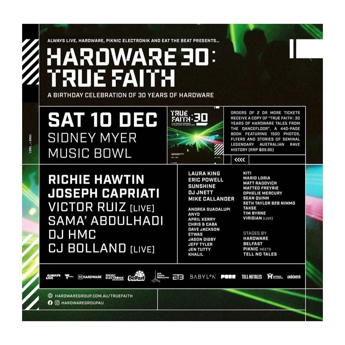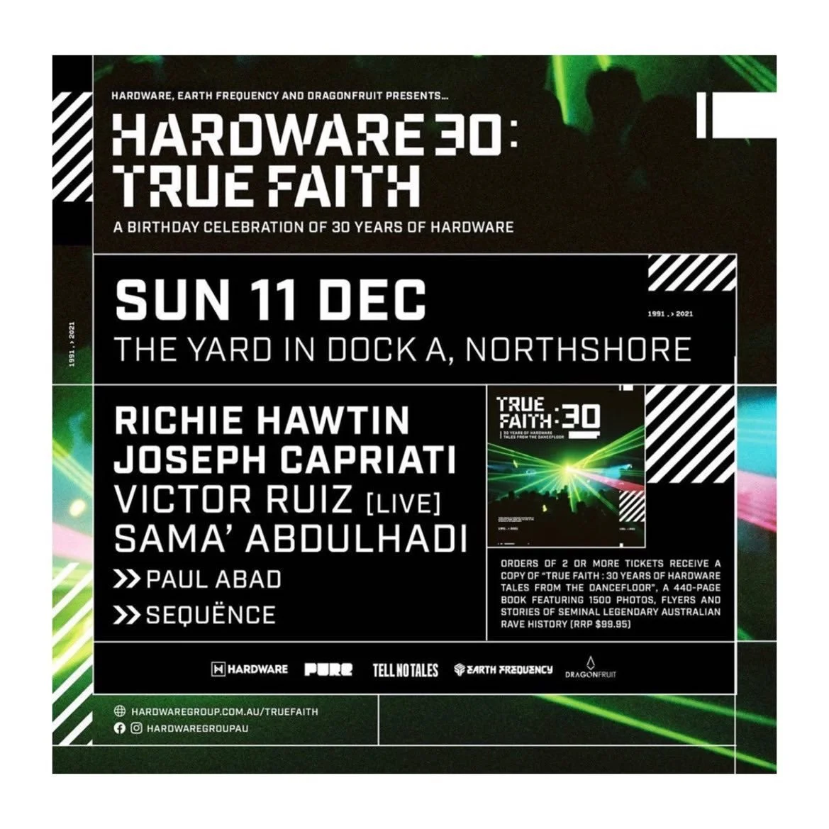The book is big. It's a 25 X 25 big square thing and people are gonna love it. I'm really excited to get that into people's hands. From December and through to January, we’ll continue the celebrations of the birthday right through the year. It’s important to me, that by the end of next year you’ll have all the flyers up or at least a whole lot of photos. There’ll be all the times of the events, you’ll know event by event, which city and who performed, and all that sort of history, reviews and information tied to the True Faith website that sits under Hardware Group. So finally, all of our history at least, will be back up there (because it's only on Wikipedia at the moment and like I said, all the history is missing).