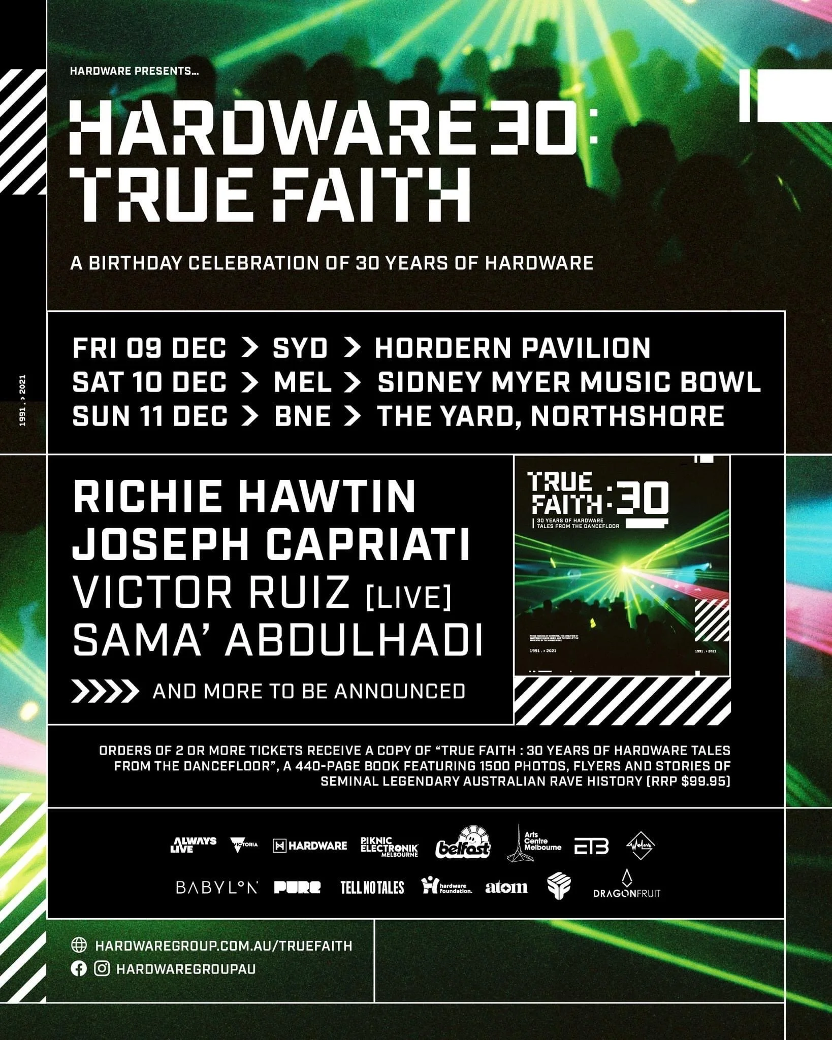 Yeah, they can via this website: https://hardwaregroup.com.au/truefaith/the-book, it'll be available via our shop for pre-orders, in the next week. And if people go to any of the events that are on sale at the moment, they can just buy the book there and it ships in November, or late November. They'll also be able to buy from bookstores in December for Christmas, through good bookstores. It's being published through Hardie Grant and they'll also be able to buy it directly from our website. They can pre-order it now. If people want to order it now, they can either buy two tickets to the birthday party and come and if it's included in that order and they just pay the postage and shipping and it will be shipped to them from the dispatcher as soon as it's in stock, or they can pre-order now through the events as well. We're putting out all the shout-outs from the artists, the birthday shout-outs also. We've got the information up there about the book and how to order the information for the events. We're going to start archiving all the old shows because one of the things during COVID I noticed is that the websites for: Future Music, Summer Daze, The Big Day Out, Sound Wave, V Festival, Two Tribes, all that great history, is no longer available online anymore, it’s only on Wikipedia. It's all gone, and all those domains have expired and were such a big part of our culture, which is a real shame. TwoTribes.com.au has expired and someone wants to sell it back to me for like $20,000. Sorry, guys, I'm just gonna re-start with an archive site. It's all my content, anyway, I put it up myself. So we've launched as part of the Birthday Celebration the True Faith website. It's going to be the archive and that's going to populate over the next six to 12 months with 30 years of photos, flyers, specifics, the event where it was, what time, who played, all that sort of stuff. So that's part of the project as well as celebrating the birthday and putting the book out. The book being so tangible, is 440 pages and two inches thick. It's a coffee table book of the highest quality. It's costing me a lot of money, but for the older people that came to my shows over the years, it's the least I can do as a thank you for their support. Also, the newer audiences that are coming to our shows, like the Piknic Électronik crew who are in their 20s, it's a great opportunity for them to read up, see these photos and read up on 30 years of history in Melbourne and Australia, through my eyes, because there is a short story in there. I'm telling the history as I've seen it from 1985 to now as well. So, it's a historical celebration over a series of events and the book, the website and all this sort of stuff. So yeah, it's very exciting.