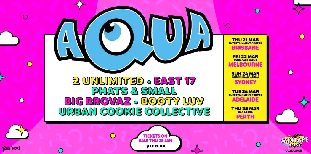 A massive night of 90’s nostalgia awaits this March with TEGMJR’s announcement of the Mixtape Festival. Heading around the country, Sydney, Melbourne, Brisbane, Adelaide and Perth attendees will all get the chance to dance the night away with some of the decade’s most influential dance artists. Making up the Mixtape Festival roster will be Barbie Girl legends Aqua, 2 Unlimited, East 17, Big Brovaz, Phats & Small, Booty Luv, and the Urban Cookie Collective.
