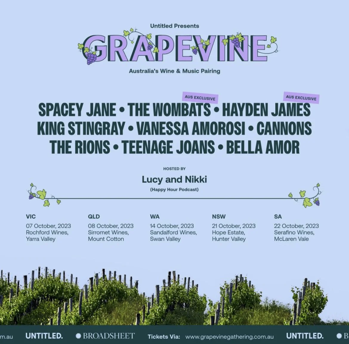 The Untitled Group have announced the return of the Grapevine Gathering festival series this October. Again taking place in some of the country’s very best wineries, with a lineup that includes Spacey Jane, The Wombats, Hayden James, King Stingray, Vanessa Amorosi, The Rions, Teenage Joans & Bella Amor