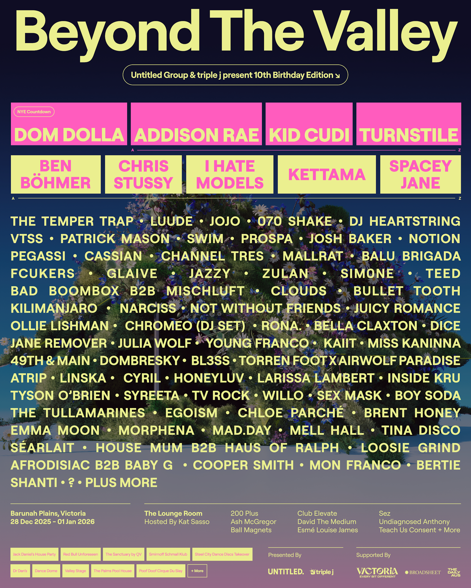 Get excited people, Beyond The Valley has revealed an eye- popping lineup to mark the massive milestone that is their 10th anniversary. Leading the charge at the picturesque Barunah Plains site from the 28th of December to the 1st of January, will be global dance sensation Dom Dolla, who will be hosting the coveted New Year’s Eve countdown set, Kid Cudi, making his first appearance in Australia in over a decade, social media pop icon Addison Rae, and genre-defying punk act Turnstile and an Australian-exclusive performance from JoJo.