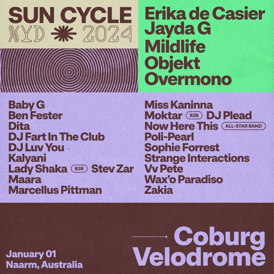 Sun Cycle NYD is back to help you start your 2024 the best way possible…with a great music festival. Sun Cycle returns to the Coburg Velodrome for a New Year’s Day celebration featuring three stages which will host an impressive roster of international and local talent from a range of genres including Erika de Casier, Overmono, Objekt, Jayda G, Mildlife, Marcellus Pittman, Ben Fester, Kaylani, Vv Pete, DJ Luv You, Wax’o Paradiso, Maara, DJ Fart In The Club, Miss Kannina, Strange Interactions and more.