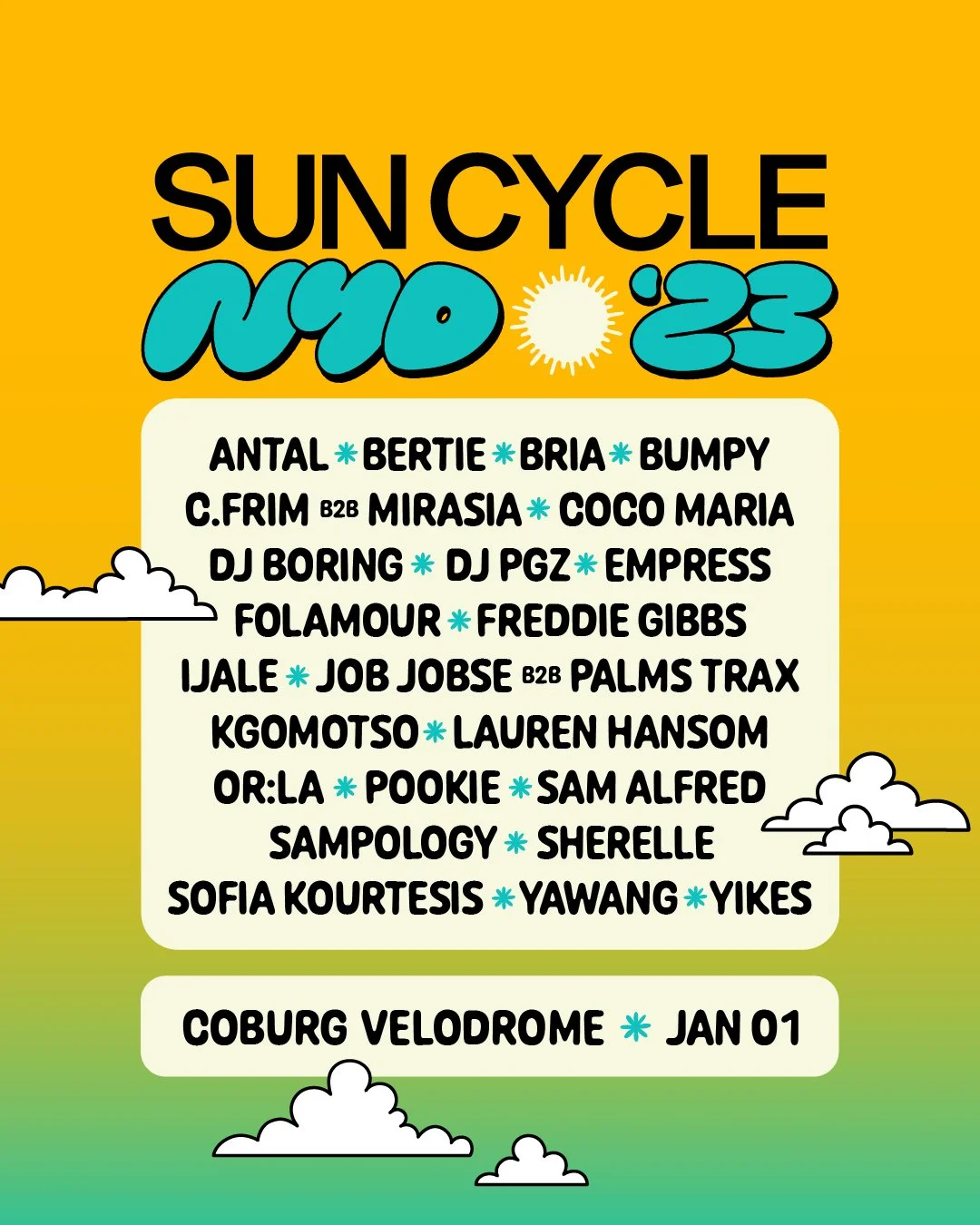 Crown Ruler, WAT Artists and Untitled Group have announced the return of Sun Cycle to the events home at the Coburg Velodrome for a New Year’s Day event with a lineup that features Freddie Gibbs, Folamour, Sherelle, Palms Trax B2B Job Jobse, OR:LA, Antal, DJ Boring, Bumpy and more.