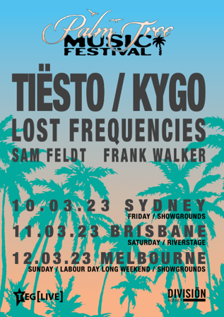 Australia, get ready, after phenomenal success in Hamptons, New York, Cabo, Mexico and Croatia, Palm Tree Music Festival is coming to our shores in March 2023 with a lineup that almost defies believing. TIËSTO, KYGO, LOST FREQUENCIES, SAM FELDT, FRANK WALKER have all been confirmed for the 3 announced shows and there are still more artists to be announced.